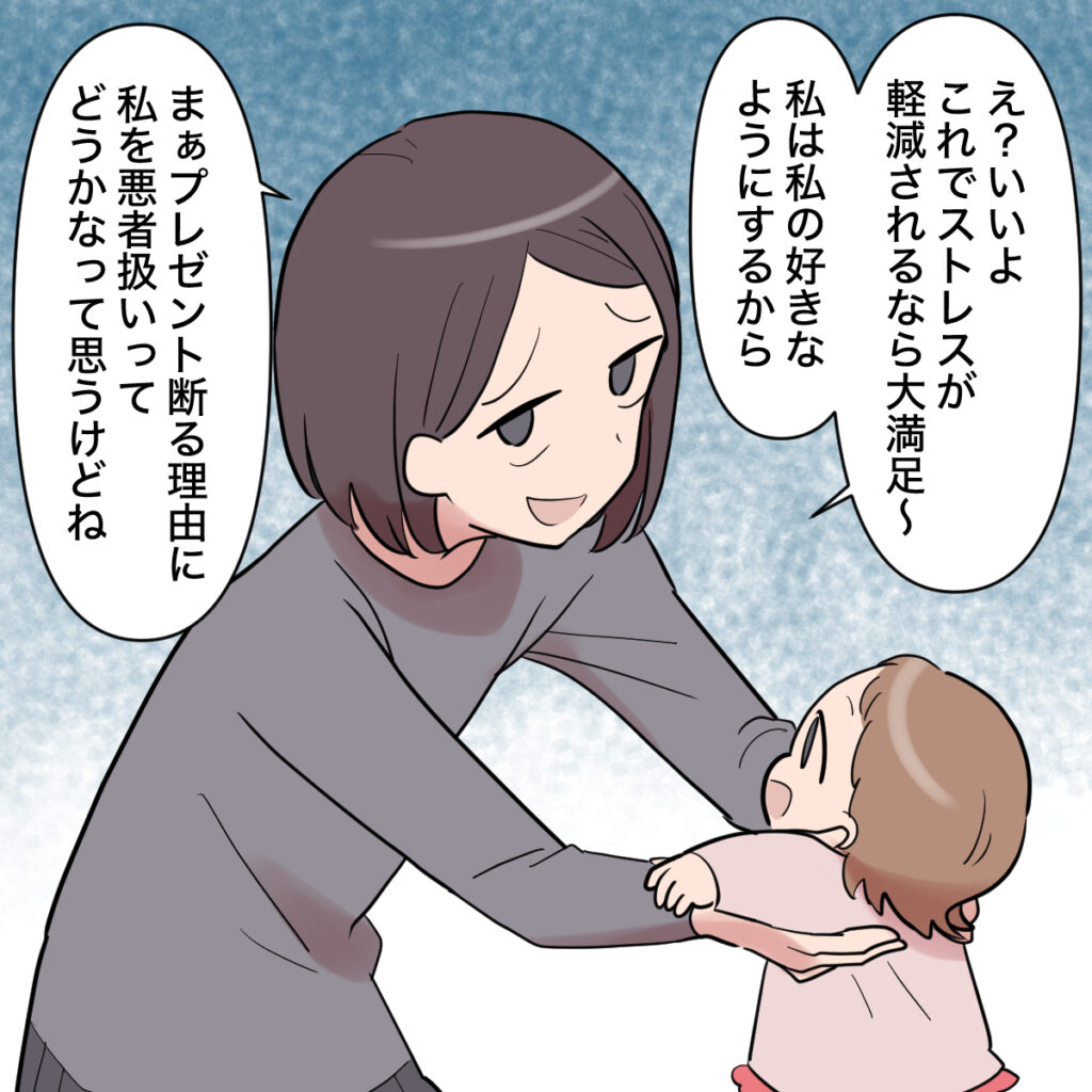 「え?いいよ。これでストレスが軽減されるなら大満足~。私は私の好きなようにするから。」と答える私は義母への印象なんて、もはやどうでもいいのです。「まぁプレゼント断る理由に私を悪者扱いってどうかなって思うけどね。」どこまでも義母の言いなりで断るのを私のせいにするショウタにもうんざりです。