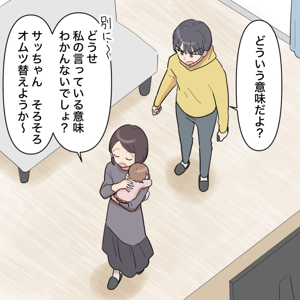 義母への告げ口を見下されムッとしたショウタは「どういう意味だよ?」と語気を強めましたが「別に~。どうせ私の言っている意味わかんないでしょ?サッちゃん、そろそろオムツ替えようか~。」と、私はもう相手にする気もありませんでした。
