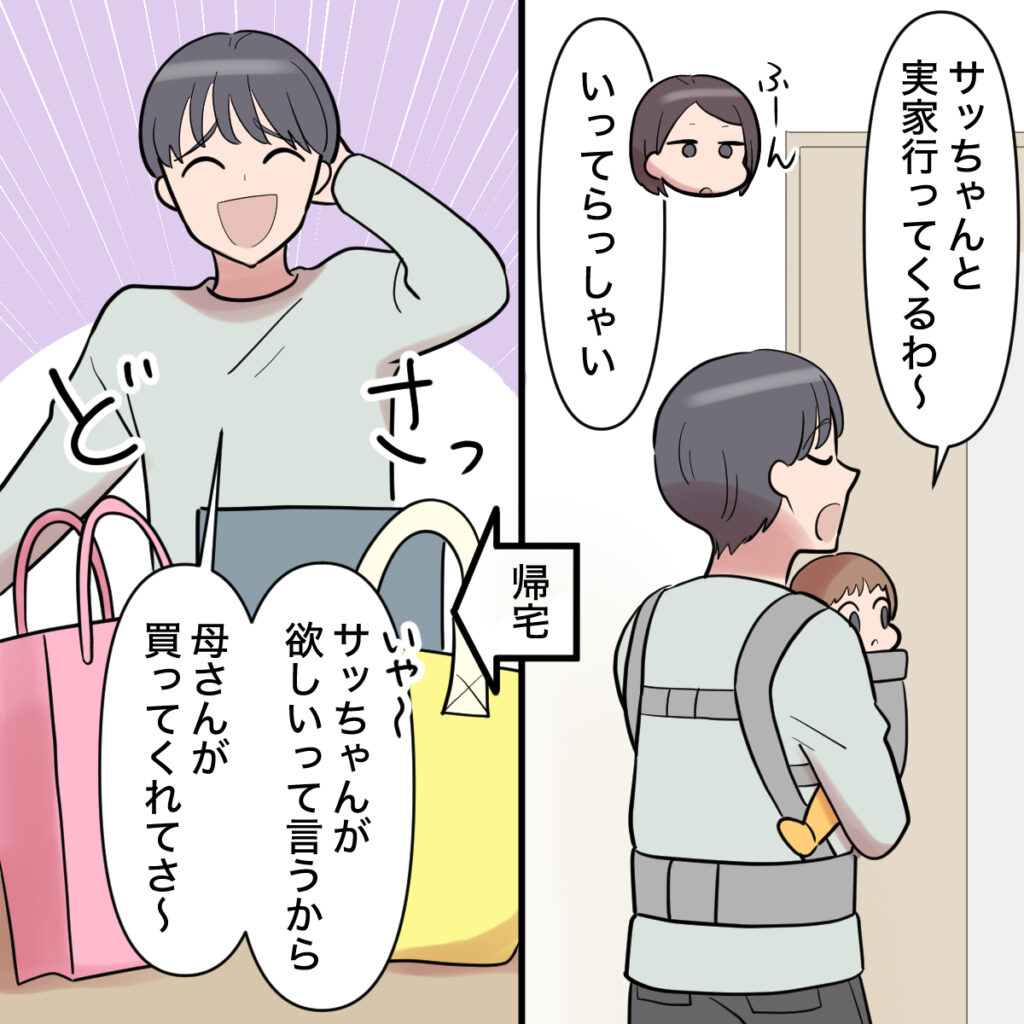 リビングに大量の荷物を置きニヤニヤしているショウタを見ながら、「あの日以降、義母に関しては完全に冷戦状態になった私たち。それでも子煩悩で良いパパであるショウタを見ていると離婚には踏み切れず・・」そんなことを考えていた私。