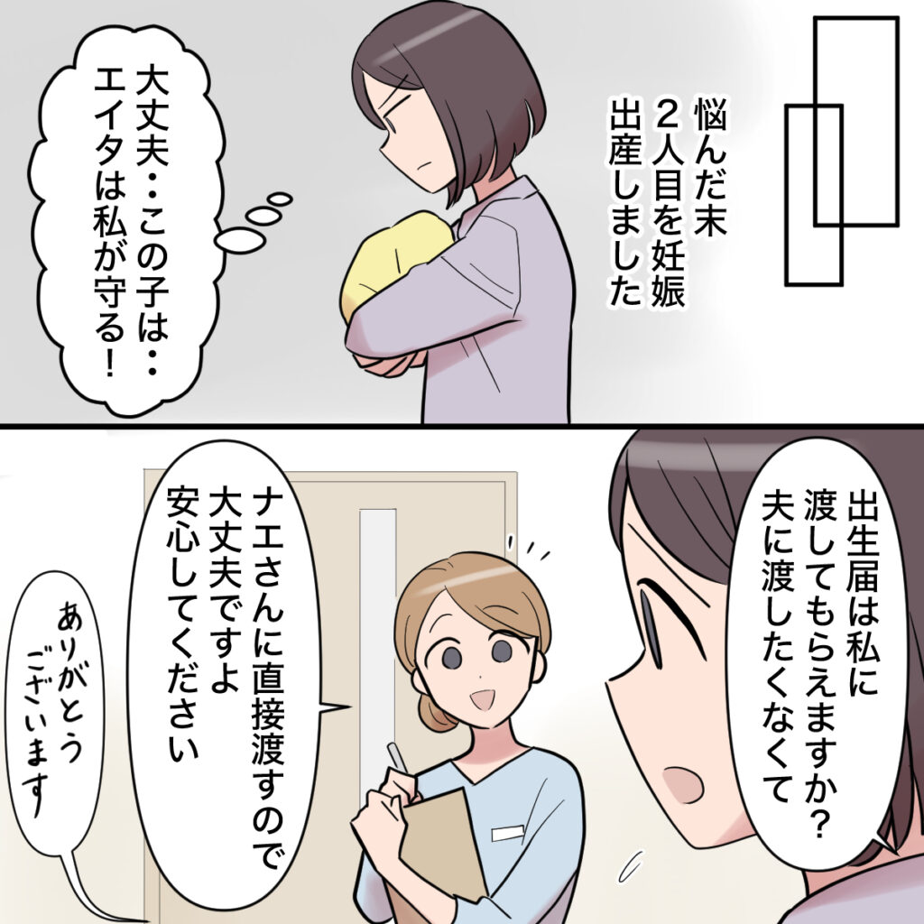 その後、悩んだ末に2人目を妊娠、出産しました。「大丈夫・・この子は・・エイタは私が守る!」と心に誓った私は、「出生届は私に渡してもらえますか?夫に渡したくなくて」看護師さんに言うと、「ナエさんに直接渡すので大丈夫ですよ。安心してください」そう言われて安心しました。
