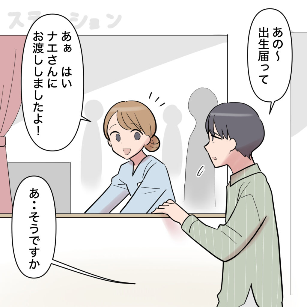 すると、「あの~出生届って」とショウタが看護師さんにたずね、「あぁ、はい。ナエさんにお渡ししましたよ!」と言われると、「あ・・そうですか」と引き下がるショウタが、