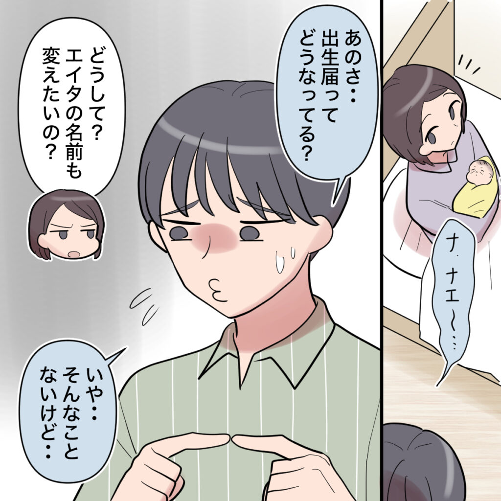 病室にやって来て「ナ、ナエ~・・あのさ・・出生届ってどうなってる?」と言いにくそうに聞いてきたショウタ。「どうして?エイタの名前も変えたいの?」私が冷たくそう言うと、「いや・・そんなことないけど・・」と困ったように呟くのでした。