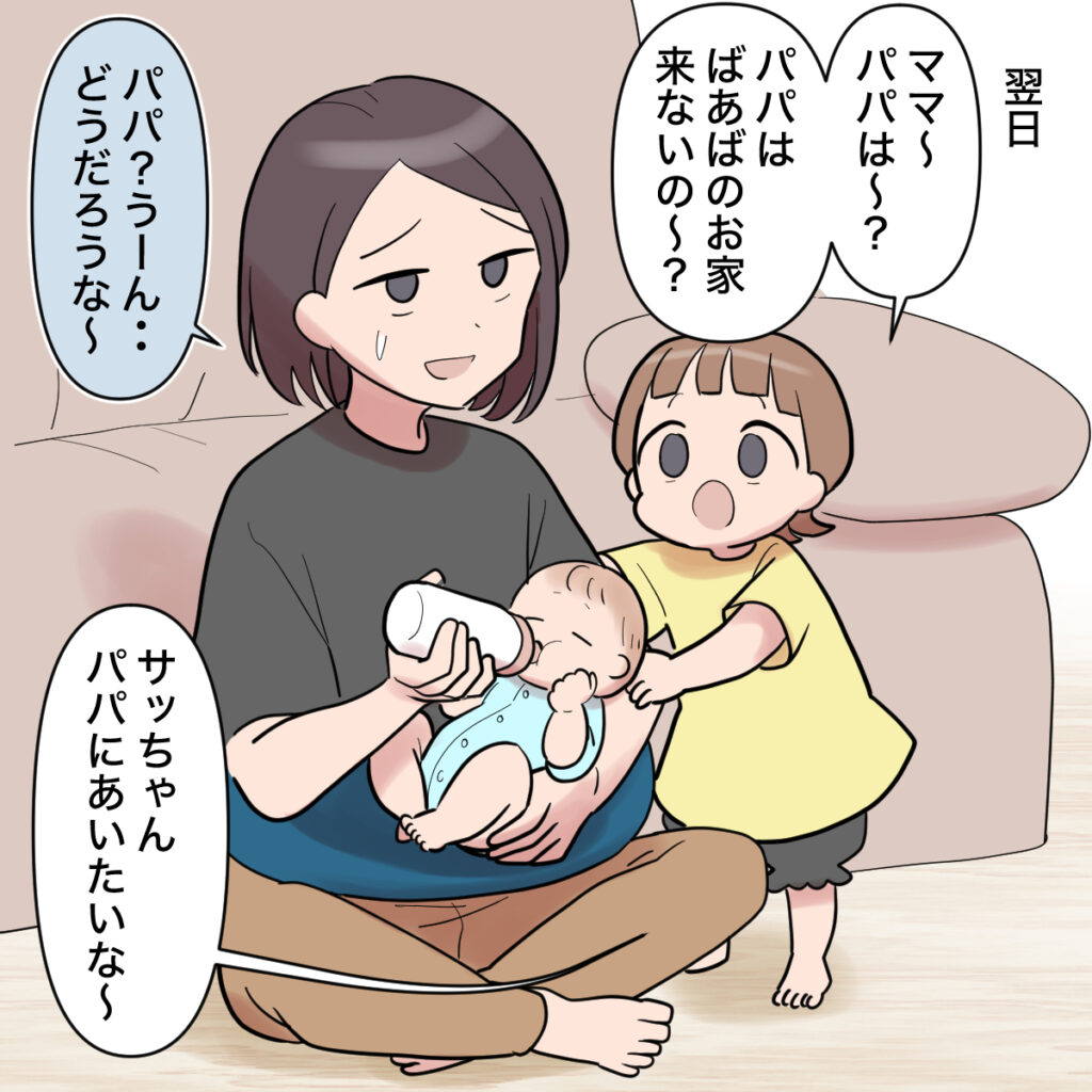 「ママ~。パパは~?パパはばあばのお家来ないの~?」不思議そうにたずねるサッちゃんに、「パパ?うーん・・どうだろうな~」と言葉を濁すと、「サッちゃんパパにあいたいな~」とサッちゃん。