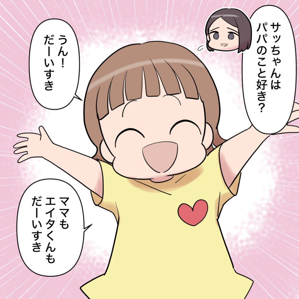 「サッちゃんはパパのこと好き?」と聞くと、「うん!だーいすき。ママもエイタくんもだーいすき」と満面の笑顔で答えました。