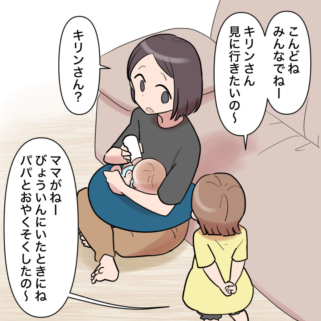 そして、「こんどね、みんなでねー、キリンさん見に行きたいの~」とサッちゃんが言い、「キリンさん?」と聞き返すと、「ママがねー、びょういんにいたときにね、パパとおやくそくしたの~」と答えました。