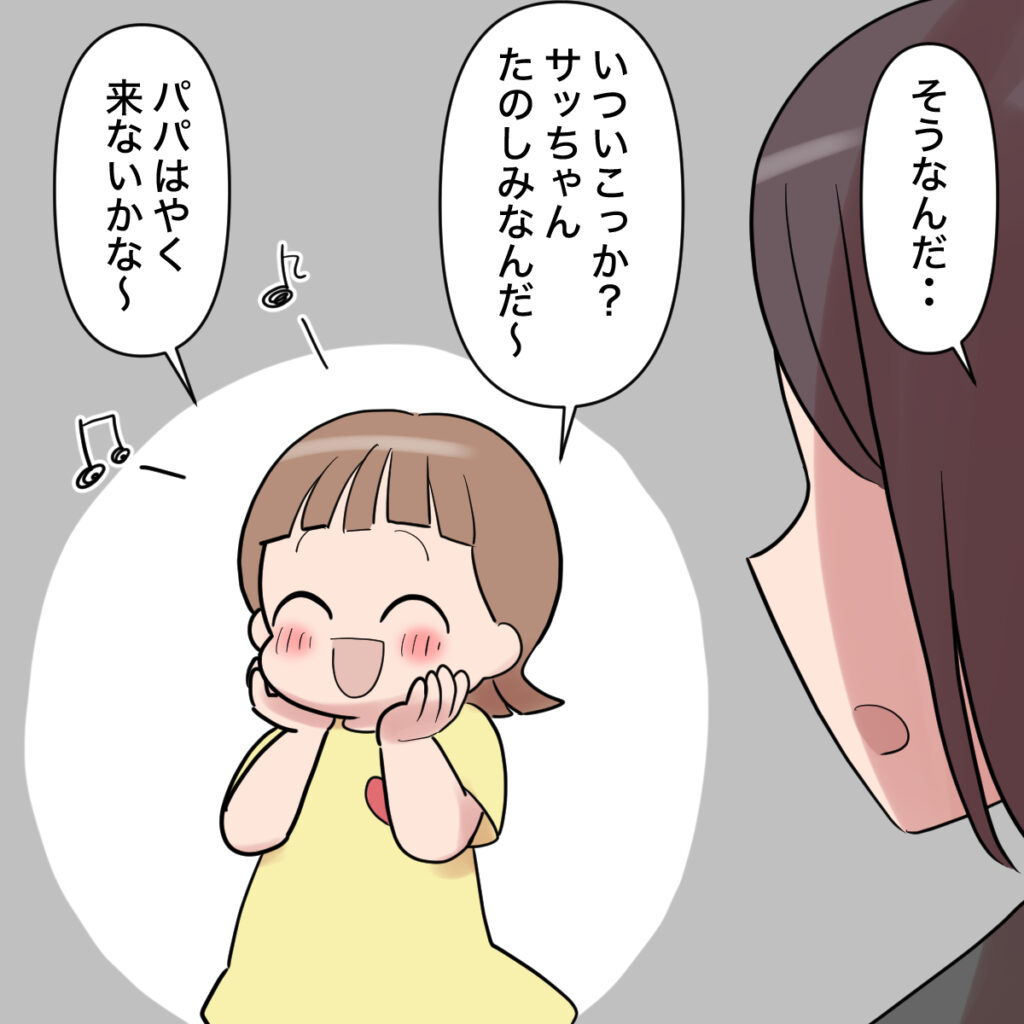 「そうなんだ・・」と驚きながら呟くと、「いついこっか?サッちゃんたのしみなんだ~。パパはやく来ないかな~」と嬉しそうにニコニコしながら話すサッちゃんを呆然としながら見つめていました。