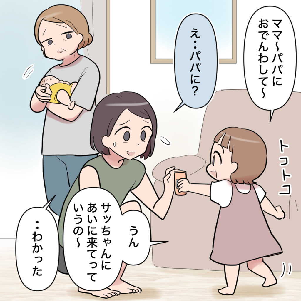 ショウタさんが妻である自分よりも義母の意見を優先してばかりなことに我慢の限界が来たナエさんは、子ども達を連れて実家に帰りました。離婚も考え始めるナエさんでしたが、翌日「パパだーいすき」「パパ早く来ないかな~」とショウタさんが来るのを心待ちにするサッちゃんを見て心が揺らぎます。