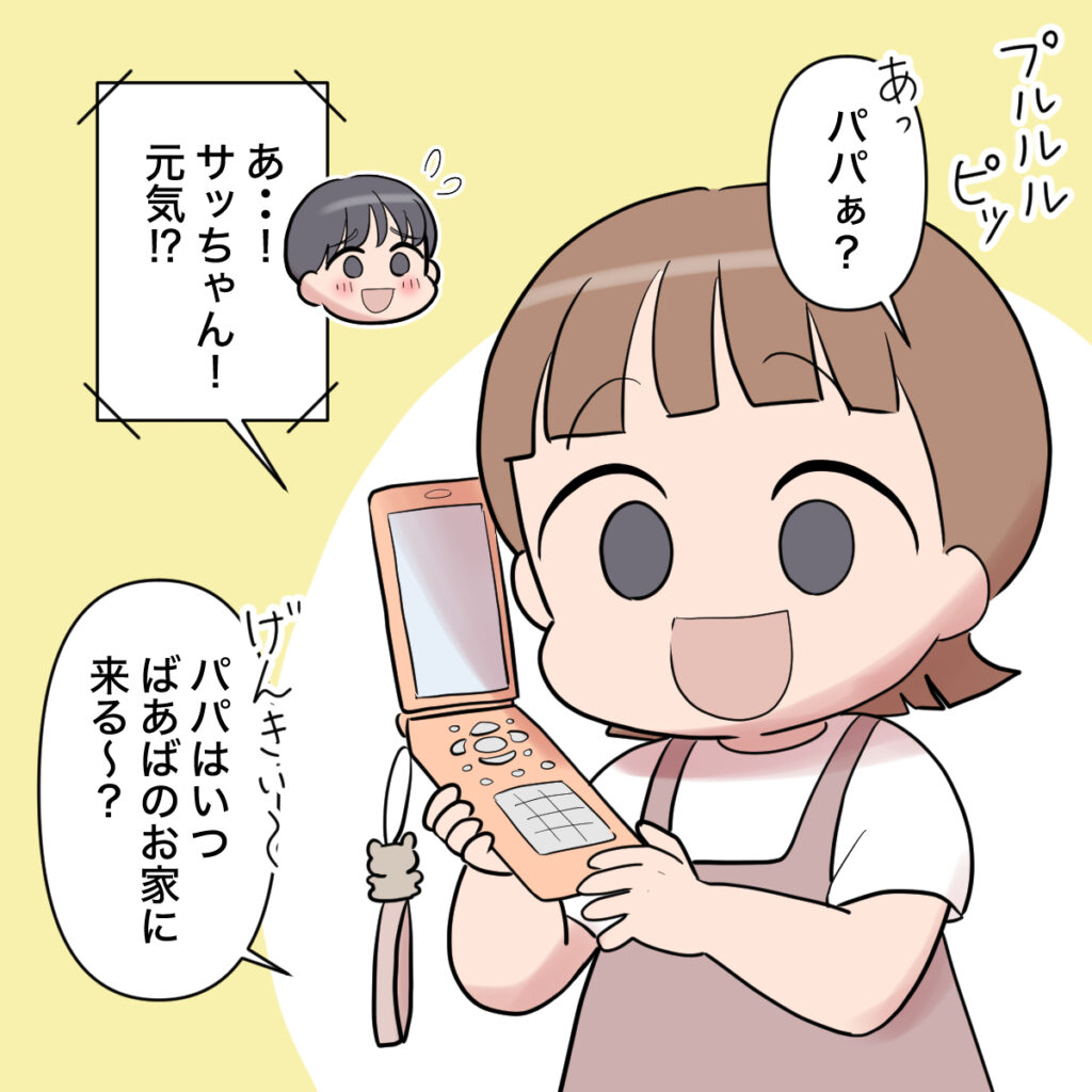 ショウタさんが電話に出ると「あっパパぁ?」と嬉しそうに言うサッちゃん。サッちゃんの声を聞き「あ・・!サッちゃん!元気!?」とショウタさんも嬉しそう。サッちゃんは「げんきぃ~」と答えると、「パパはいつばあばのお家に来る~?」と聞きました。