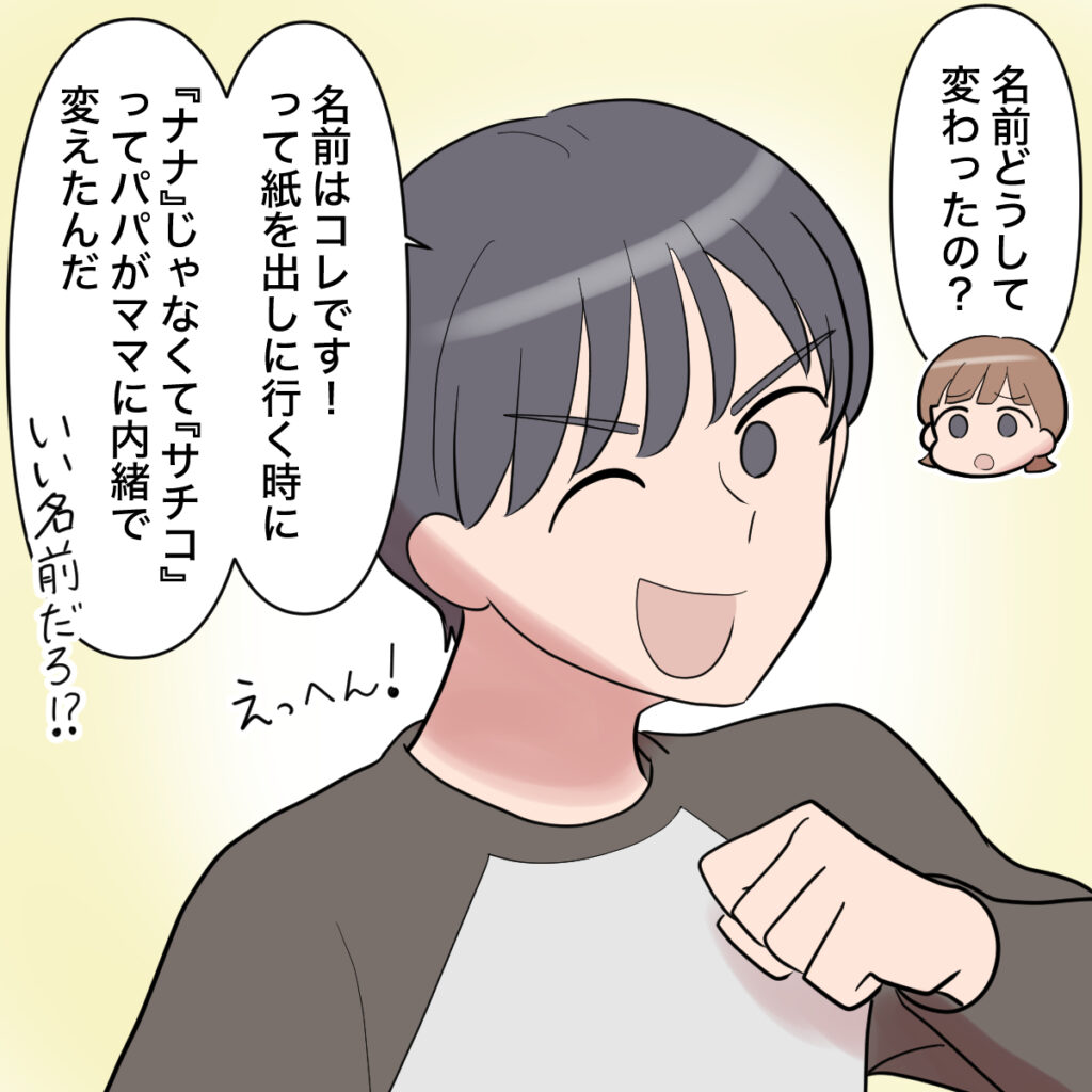 そして「名前どうして変わったの?」サッちゃんの言葉に、「名前はコレです!って紙を出しに行く時に、『ナナ』じゃなくて『サチコ』ってパパがママに内緒で変えたんだ。いい名前だろ?」と自慢げに答えるショウタ。