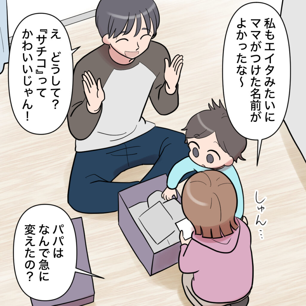 すると、「私もエイタみたいに、ママがつけた名前がよかったな~」しゅんとしながらそう言うサッちゃんに、「え、どうして?『サチコ』ってかわいいじゃん!」ショウタがそう言うと、「パパはなんで急に変えたの?」と聞き返すサッちゃん。