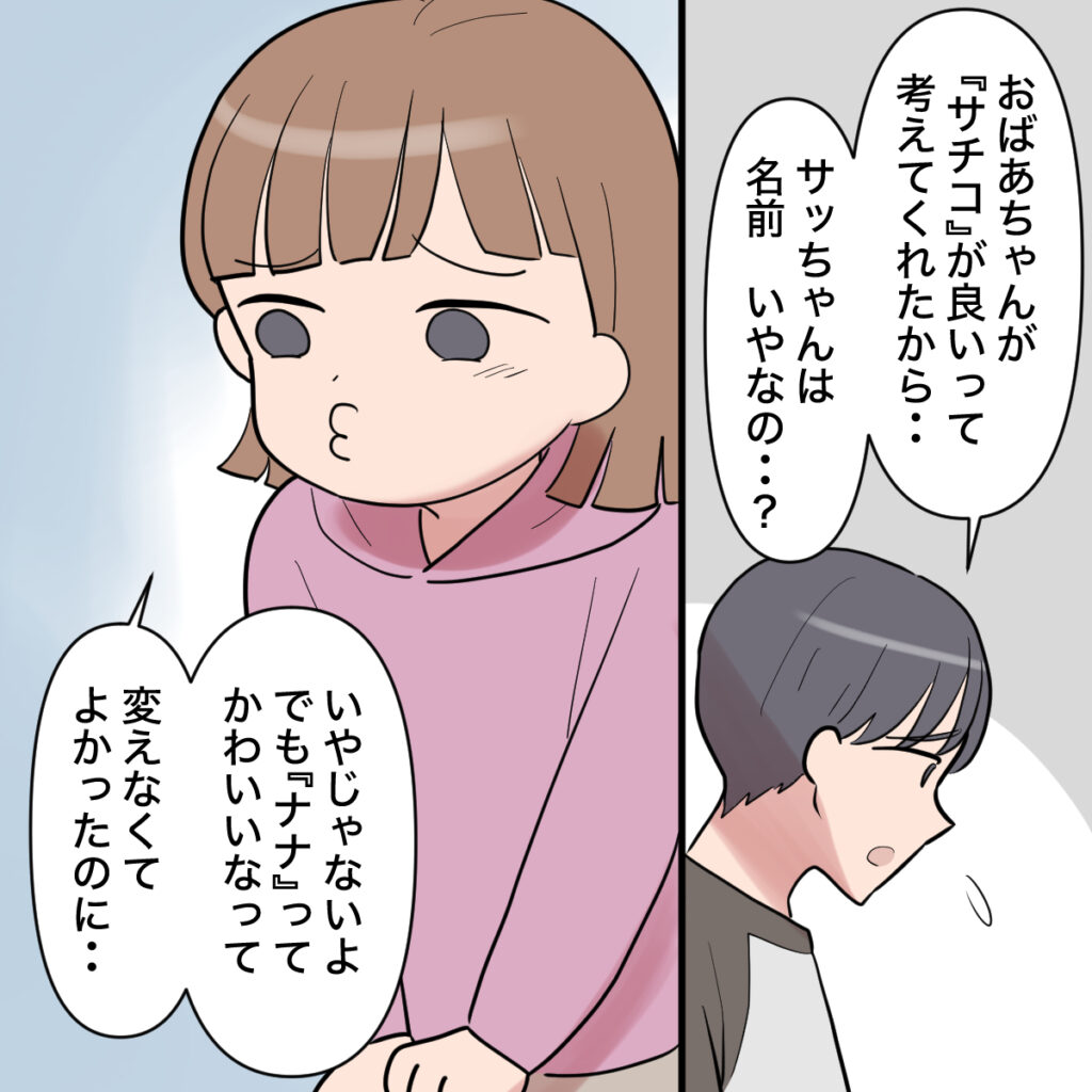 「おばあちゃんが『サチコ』が良いって考えてくれたから・・サッちゃんは名前、いやなの・・?」ショウタが少し困惑しながらそう言うと、「いやじゃないよ。でも『ナナ』ってかわいいなって。変えなくてもよかったのに・・」サッちゃんが少し落ち込みながらそう言うと、