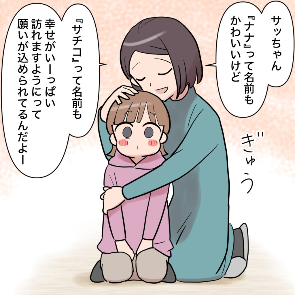 「サッちゃん。『ナナ』って名前もかわいいけど、『サチコ』って名前も、幸せがいーっぱい訪れますようにって願いが込められてるんだよー」サッちゃんぎゅうっと抱きしめながらそう言うと、