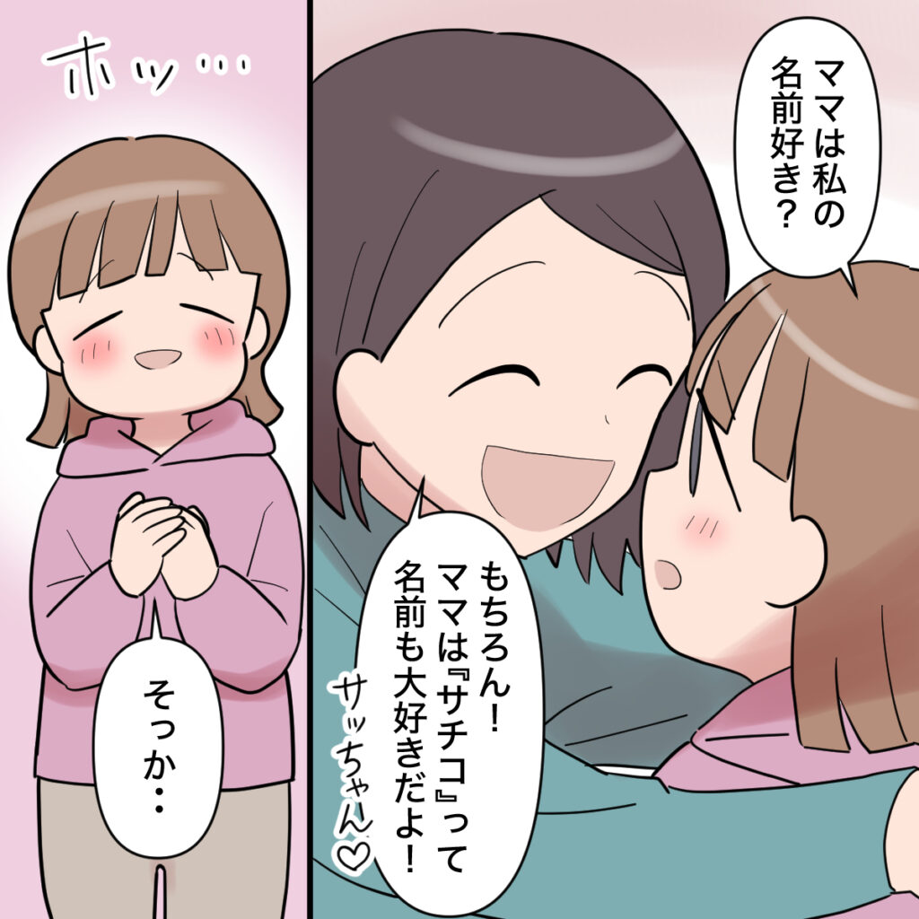 「ママは私の名前好き?」サッちゃんにそう聞かれて、「もちろん!ママは『サチコ』って名前も大好きだよ!サッちゃん」そう言うと、「そっか・・」とホッとしたように答えるのでした。