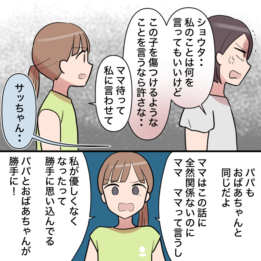 「ショウタ・・私のことは何を言ってもいいけど、この子を傷つけるようなことを言うなら許さな・・」そう言いかけると、「ママ待って。私に言わせて」と後ろに立っていたサッちゃんが言い、「パパもおばあちゃんと同じだよ。ママはこの話に全然関係ないのにママ、ママって言うし、私が優しくなくなったって勝手に思い込んでる。パパとおばあちゃんが勝手に!」ショウタに向かってキッパリと言い放つサッちゃんは、