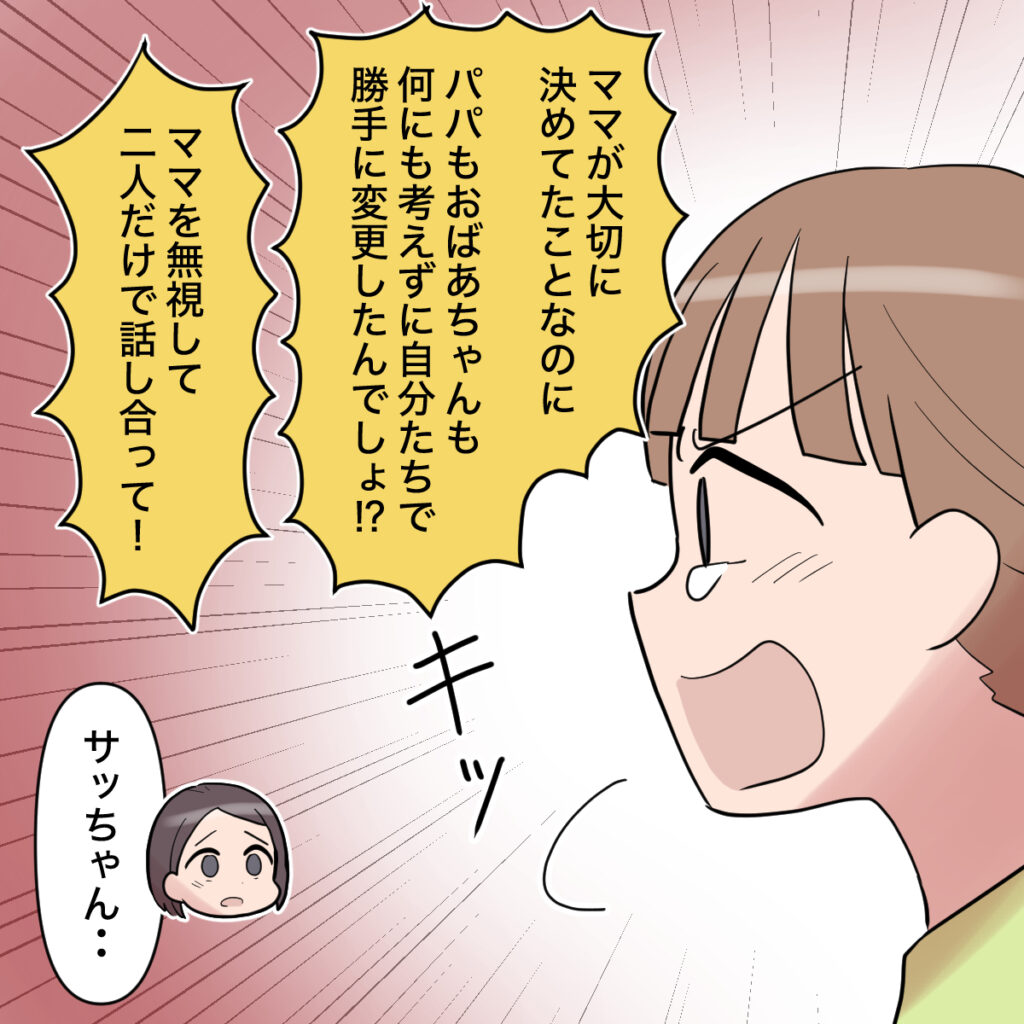 「ママが大切に決めてたことなのに、パパもおばあちゃんも、何にも考えずに自分たちで勝手に変更したんでしょ!?ママを無視して二人だけで話し合って!」ショウタを睨みながら言うサッちゃんに私も驚きました。