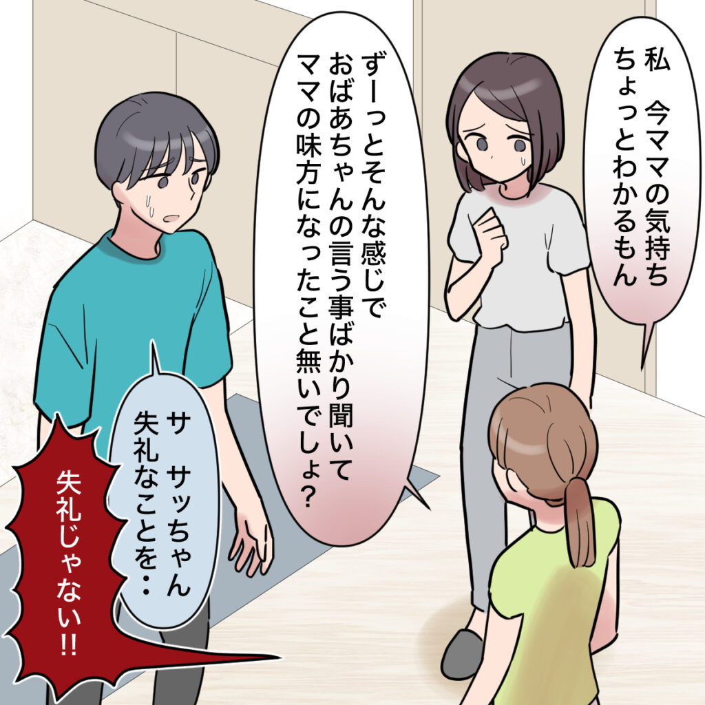 すると、「私、今ママの気持ちちょっとわかるもん。ずーっとそんな感じで、おばあちゃんの言う事ばかり聞いて、ママの味方になったこと無いでしょ?」サッちゃんの言葉に、「さ、サッちゃん失礼なことを・・」と言いかけるショウタの声を遮って、「失礼じゃない!!」と大きな声で言うサッちゃん。