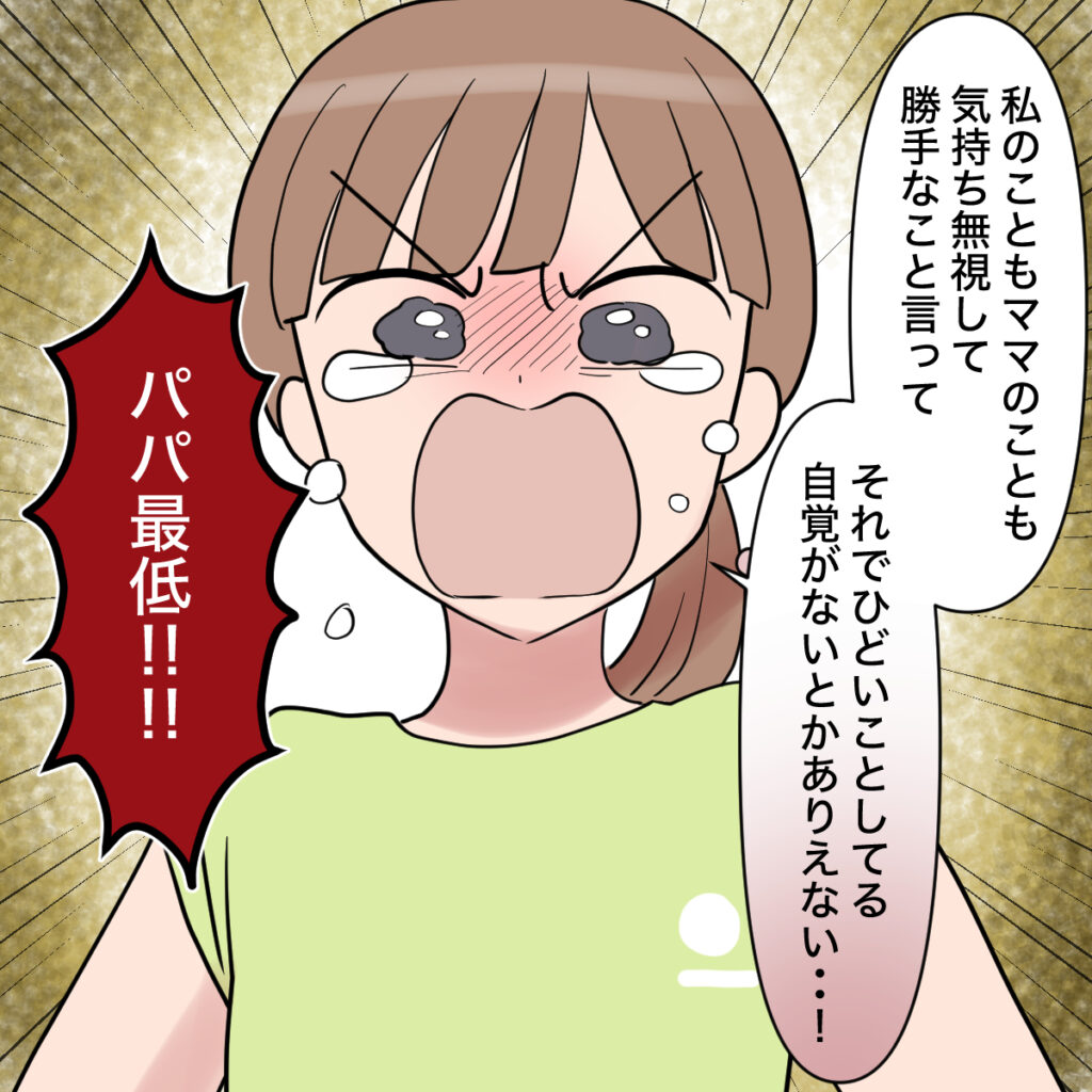 「私のこともママのことも気持ち無視して勝手なこと言って、それでひどいことしてる自覚がないとかありえない・・!パパ最低!!」ショウタへの気持ちを思いっきりぶつけたのでした。