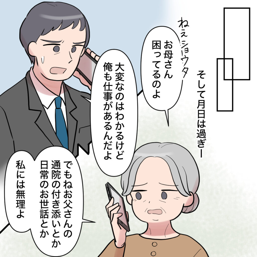 「ねぇショウタ。お母さん困ってるのよ」義母にそう言われ、「大変なのはわかるけど俺も仕事があるんだよ」ショウタが断ると、「でもね、お父さんの通院の付き添いとか、日常のお世話とか・・・私には無理よ」と言う義母に、