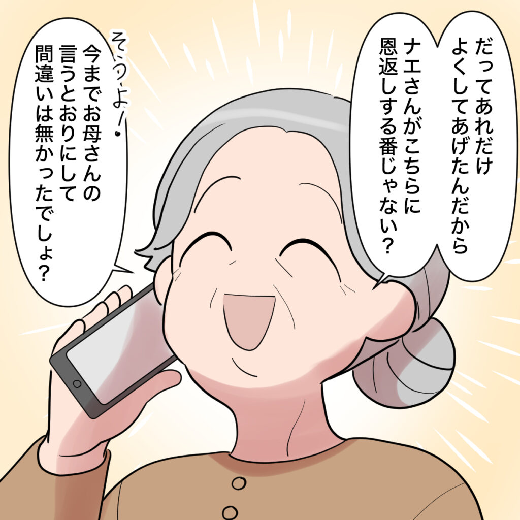 だってあれだけよくしてあげたんだから、ナエさんがこちらに恩返しする番じゃない?そうよ!今までお母さんの言う通りにして間違いはなかったでしょ?」笑顔でそう言う義母に、