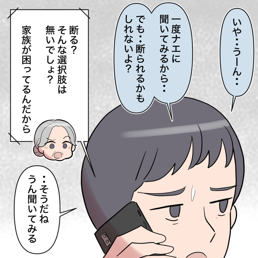 「いや・・いうーん・・一度ナエに聞いてみるから・・でも・・断られるかもしれないよ?」ショウタがそう言い返すと、「断る?そんな選択肢はないでしょ?家族が困ってるんだから」義母にそう言われ、「・・そうだね。うん聞いてみる」と答えました。