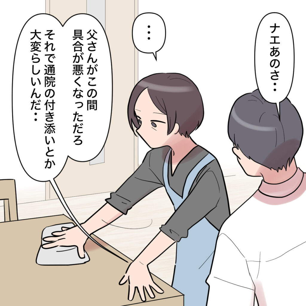 そして、「ナエあのさ・・」と声をかけるも無言のまま。「父さんがこの間具合が悪くなっただろ。それで通院の付き添いとか大変らしいんだ・・」とショウタが言いました。
