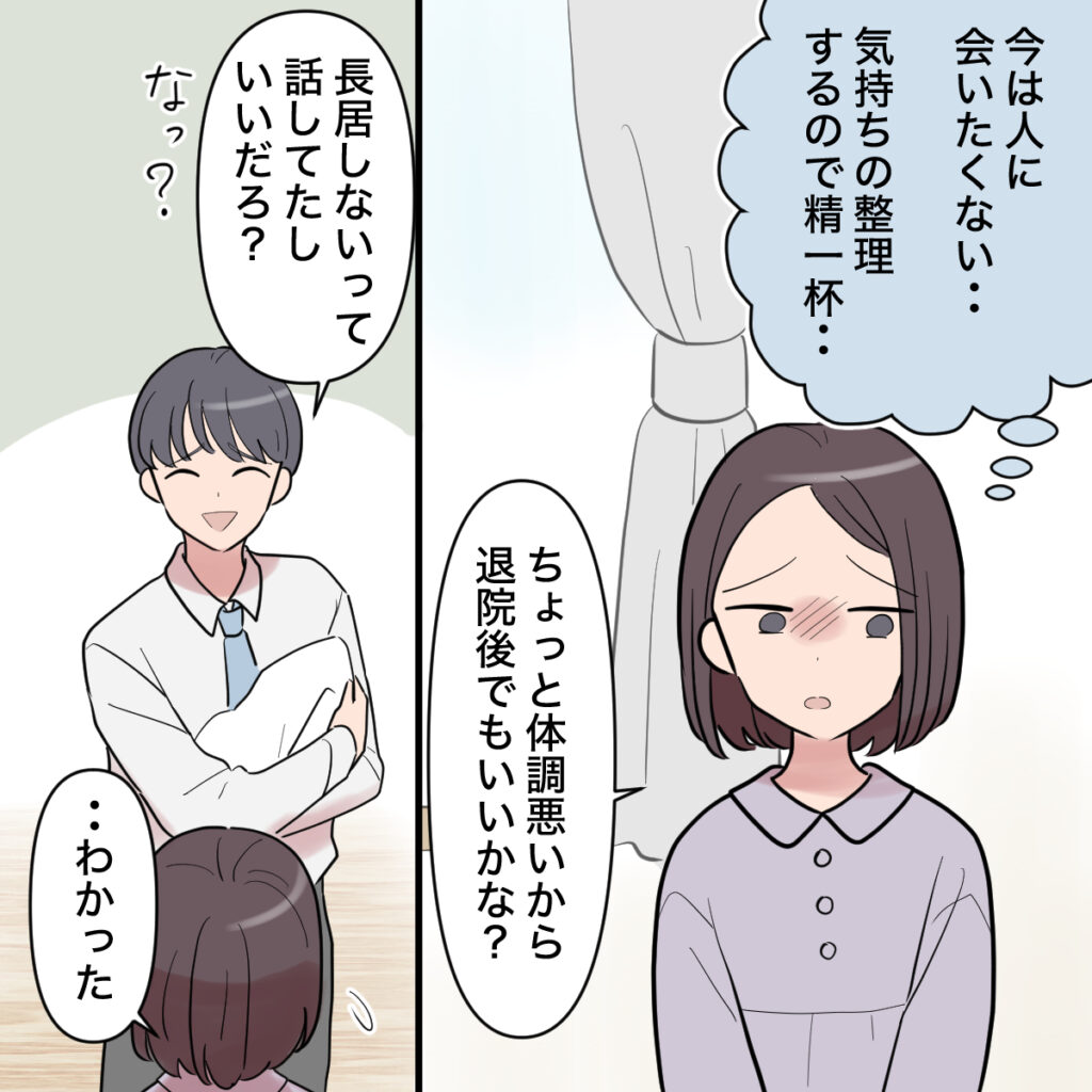 本当は人に会いたくありませんでした。気持の整理をするので精いっぱいだったからです。「ちょっと体調悪いから退院後でもいいかな?」とショウタに言いましたが、「長居しないって話してたし、いいだろ?な?」私の都合なんて聞く気がないみたいでした。