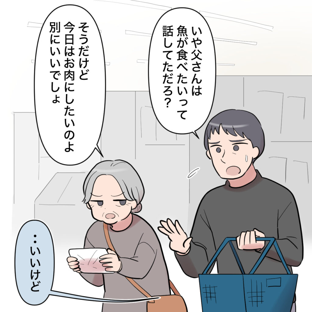 この日は日用品の買い出しのサポートでした。肉を手に取った義母に「いや父さんは魚が食べたいって話してただろ?」と伝えても、「そうだけど。今日はお肉にしたいのよ。別にいいでしょ」と言われ「・・いいけど」とそれ以上は強く言えないショウタ。