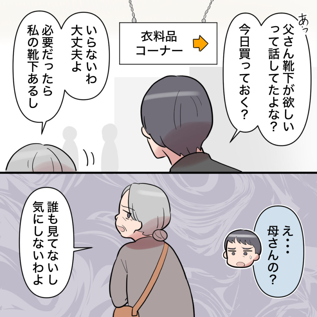 衣料品コーナーの横を通りかかり「あっ。父さん靴下が欲しいって話してたよな?今日買っておく?」とショウタが言っても「いらないわ。大丈夫よ。必要だったら私の靴下あるし」と平然と言う義母。「え・・母さんの?」と戸惑うショウタに「誰も見てないし気にしないわよ」と義父がどう思うかは一切考えない義母です。