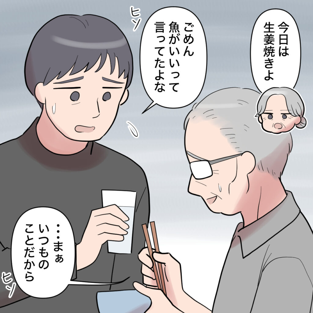帰宅後、魚が食べたいと言っていた義父に平然と「今日は生姜焼きよ」と伝える義母。ショウタさんがこっそり「ごめん。魚がいいって言ってたよな」と義母の代わりに謝ると、義父は「・・まぁいつものことだから」と苦笑い。