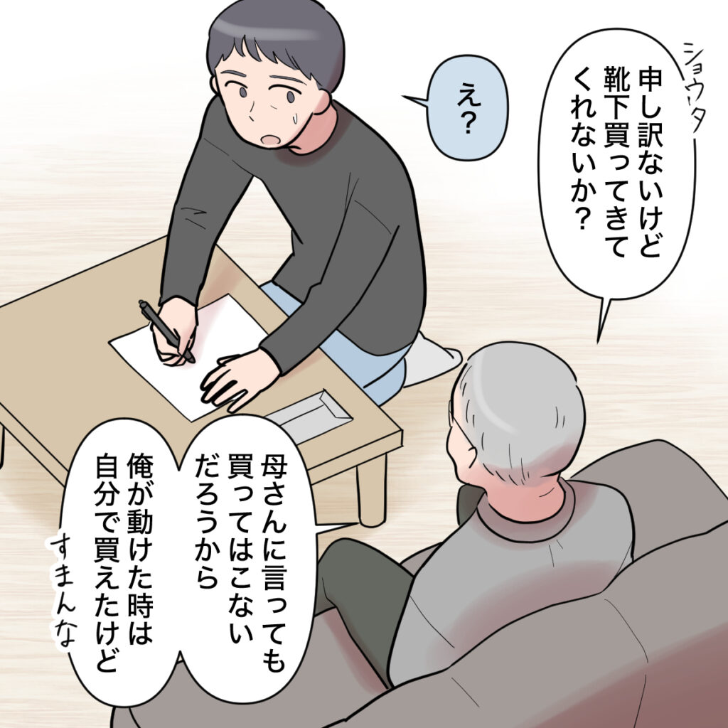 食後、義母が席を外している時に「ショウタ、申し訳ないけど靴下買ってきてくれないか?」と義父が言いました。「え?」と驚くショウタに「母さんに言っても買ってはこないだろうから。俺が動けた時は自分で買えたけど。すまんな」と申し訳なさそうにお願いする義父。