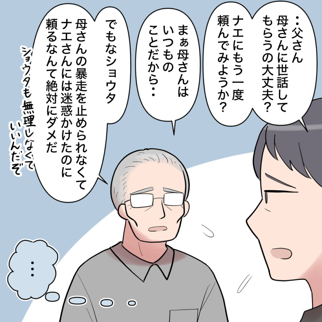 義母が義父の要望を何も聞いていない様子を目の当たりにして心配になったショウタは「・・父さん、母さんに世話してもらうの大丈夫?ナエにもう一度頼んでみようか?」と言いましたが、義父は「まぁ母さんはいつものことだから・・」と諦めたように言ったあと「でもなショウタ。母さんの暴走を止められなくてナエさんには迷惑かけたのに頼るななんて絶対にダメだ。ショウタも無理しなくていいんだぞ」と諭すように言いました。義父の言葉にショウタは何も言えませんでした。