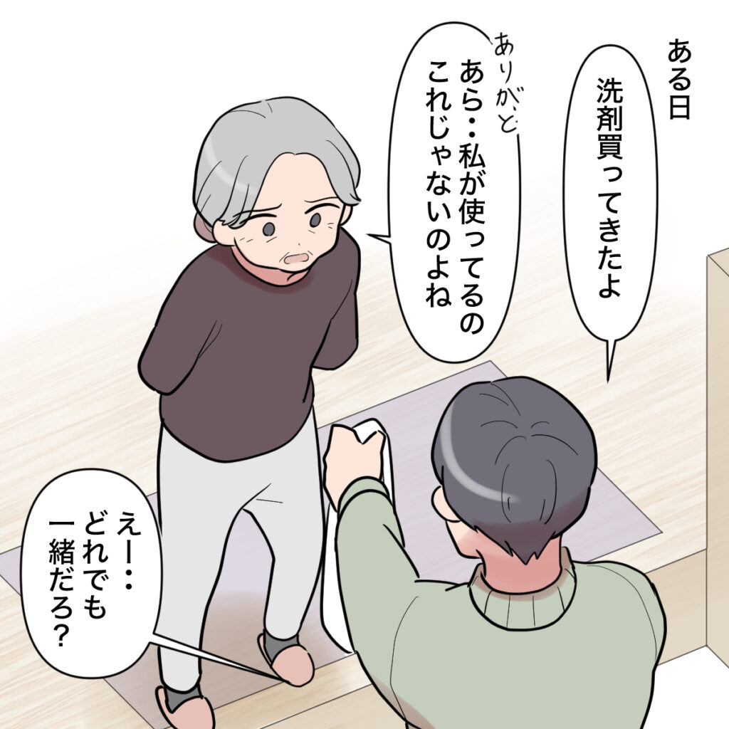 ある日、義母に洗剤を頼まれていたショウタが「洗剤買ってきたよ」と渡すと、義母は「ありがと」と言いながら袋の中を見ると「あら・・私が使ってるのこれじゃないのよね」と言いました。ショウタが「えー・・どれでも一緒だろ?」と面倒くさそうに言うと、