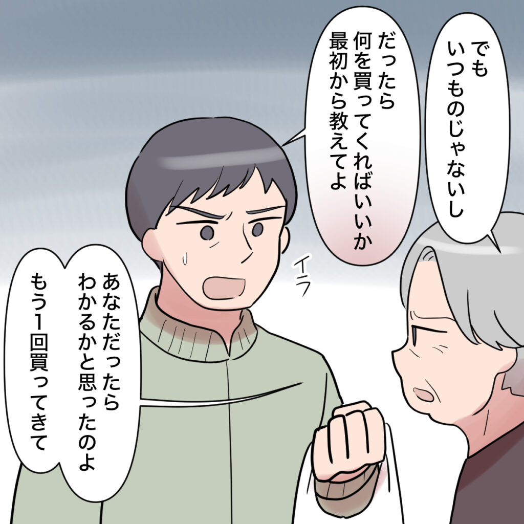 「でもいつものじゃないし」と譲らない義母。ショウタがイラっとして「だったら何を買ってくればいいか最初から教えてよ」と言うと「あなただったらわかるかと思ったのよ。もう1回買ってきて」と平然と言いました。