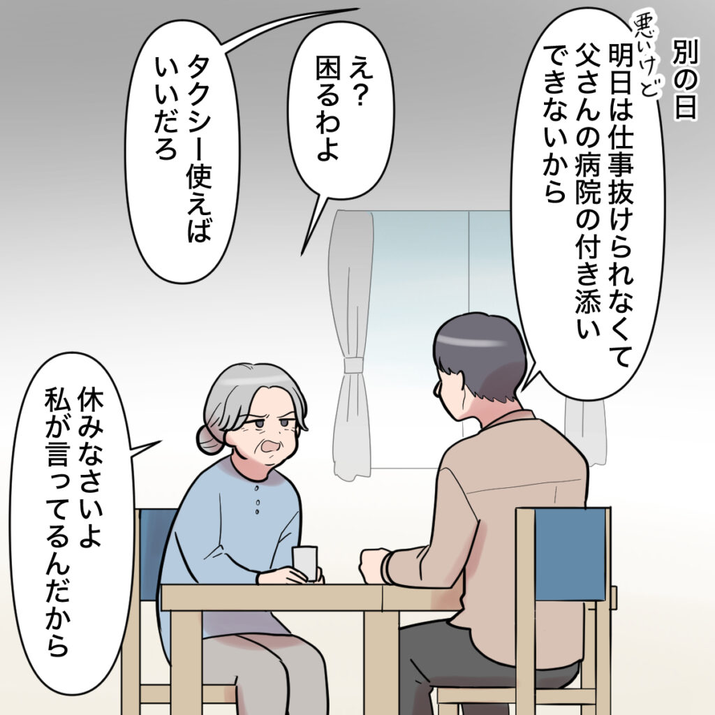 別の日。ショウタが「悪いけど、明日は仕事抜けられなくて父さんの病院の付き添いできないから」と伝えると、「え?困るわよ」と義母は不機嫌に。「タクシー使えばいいだろ」と言うと、「休みなさいよ。私が言ってるんだから」と命令口調になる義母。