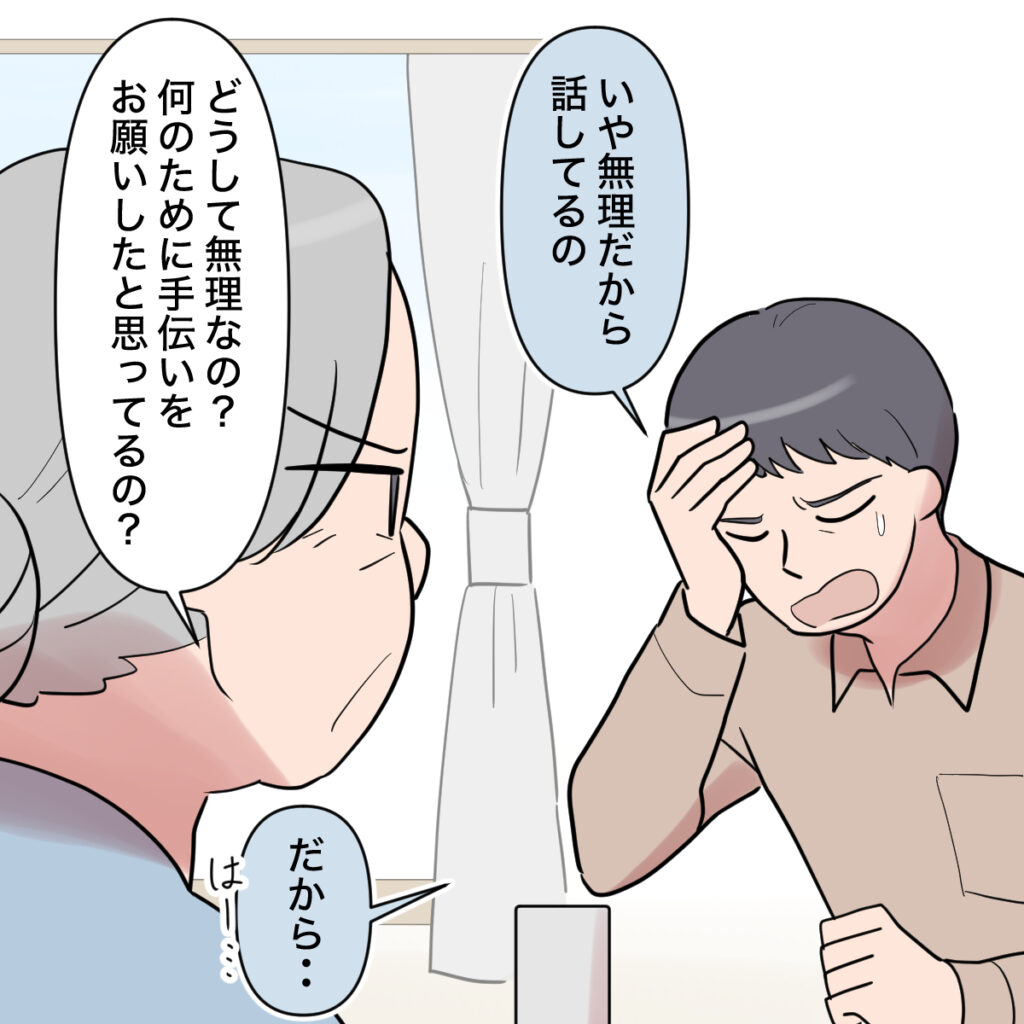 「いや、無理だから話してるの」と溜息まじりにショウタが言うと、「どうして無理なの?何のために手伝いをお願いしたと思ってるの?」と納得しない義母。「だから・・」と言いかけたショウタは、何を言っても無駄だと感じ「はー・・」と溜息。