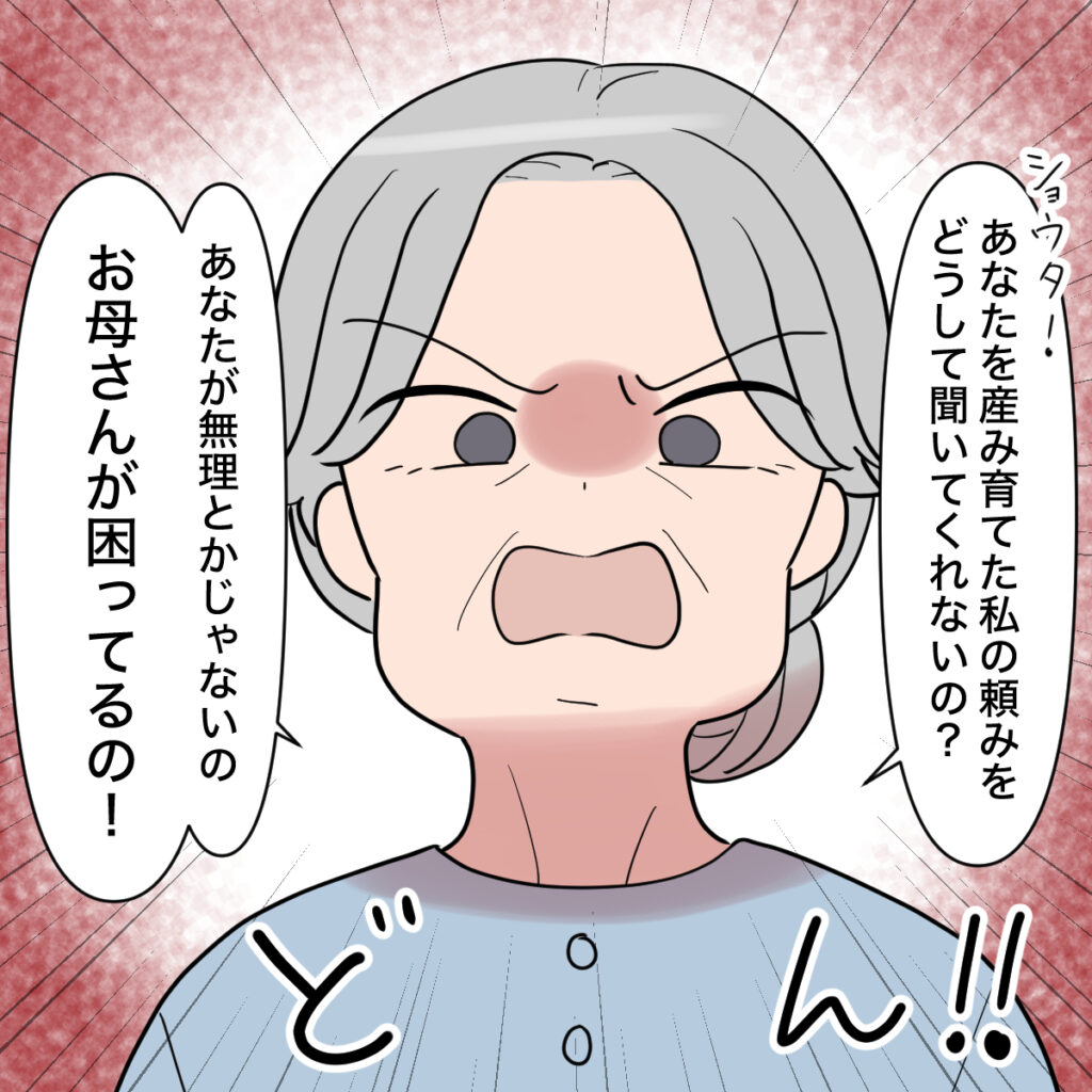 すると、義母は「ショウタ!あなたを産み育てた私の頼みをどうして聞いてくれないの?あなたが無理とかじゃないの。お母さんが困ってるの!」と怒りだしました。