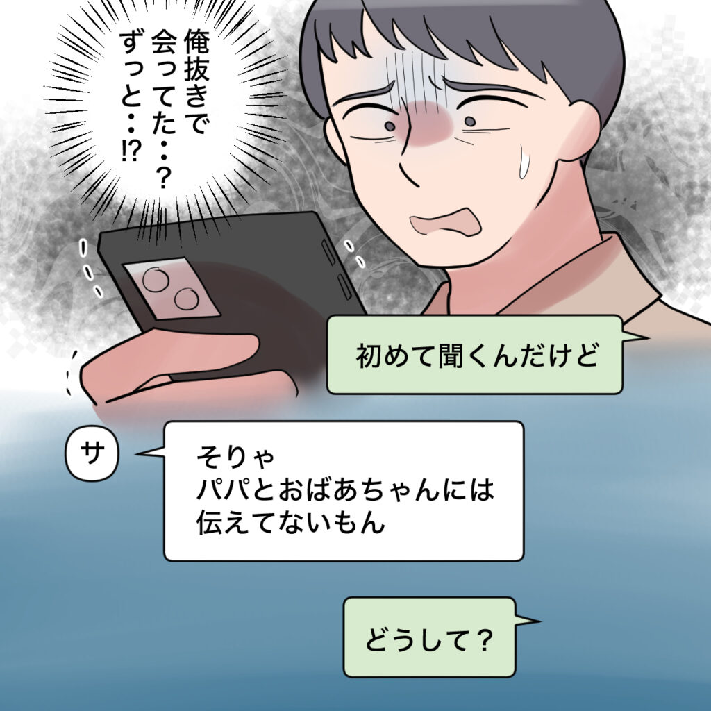 サッちゃんから初めてそれを知らされたショウタは「俺抜きで会ってた・・?ずっと・・?」とショックを受けながら『初めて聞くんだけど』とサッちゃんに送ると、『そりゃパパとおばあちゃんには伝えてないもん』とあっけらかんとした返信。ショウタは『どうして?』聞きました。