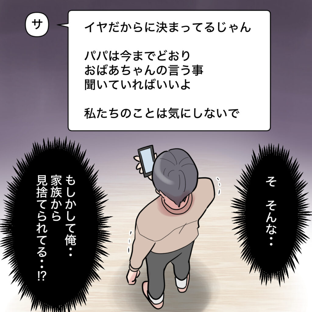 『イヤだからに決まってるじゃん。パパは今までどおりおばあちゃんの言う事聞いてればいいよ。私たちのことは気にしないで』サッちゃんからの見放したような返信を見て、「そ、そんな・・もしかして俺・・家族から見捨てられてる・・!?」とショウタは初めて気付いたようです。