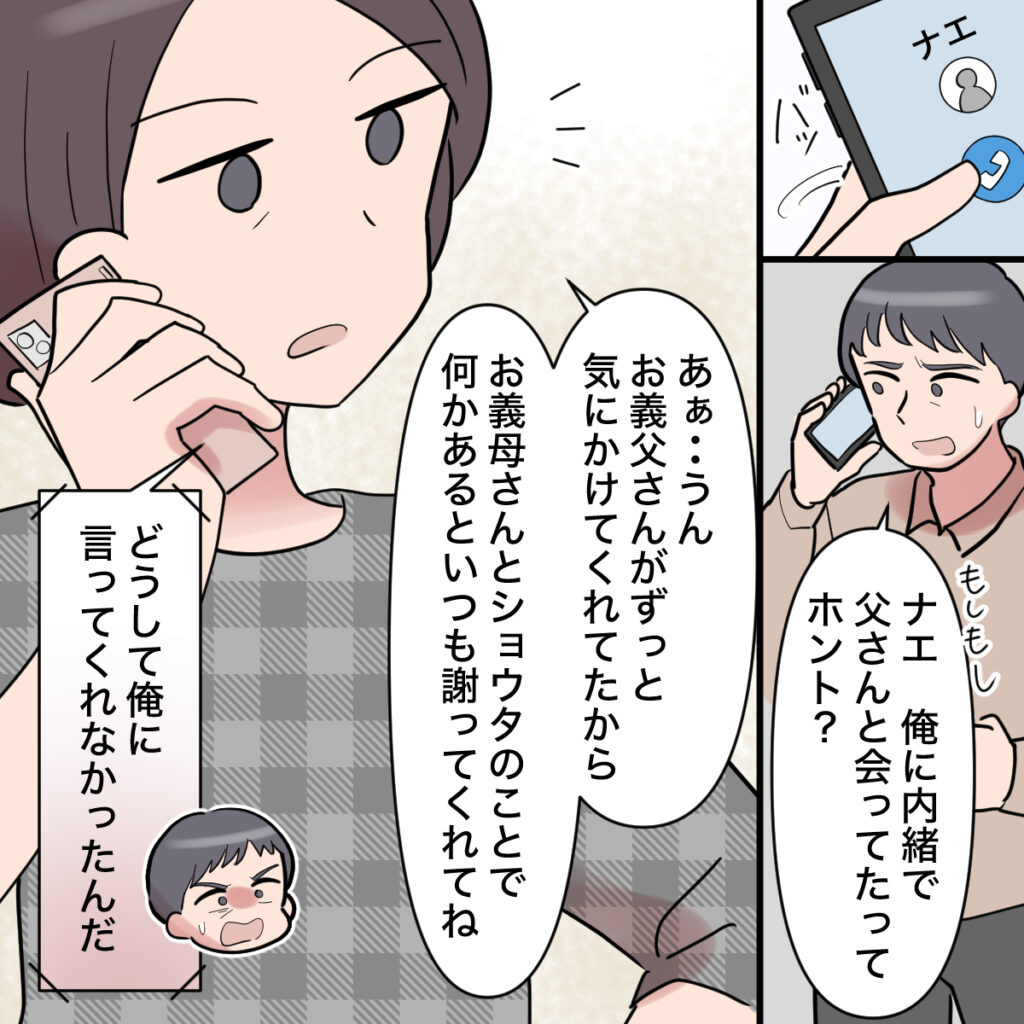 ショウタから慌てた様子で電話がかかってきました。「ナエ、俺に内緒で父さんと会ってたってホント?」と聞かれたので「あぁ・・うん。お義父さんがずっと気にかけてくれてたから。お義母さんとショウタのことで何かあるといつも謝ってくれてね」と答えました。すると「どうして俺に言ってくれなかったんだ」と言うので、