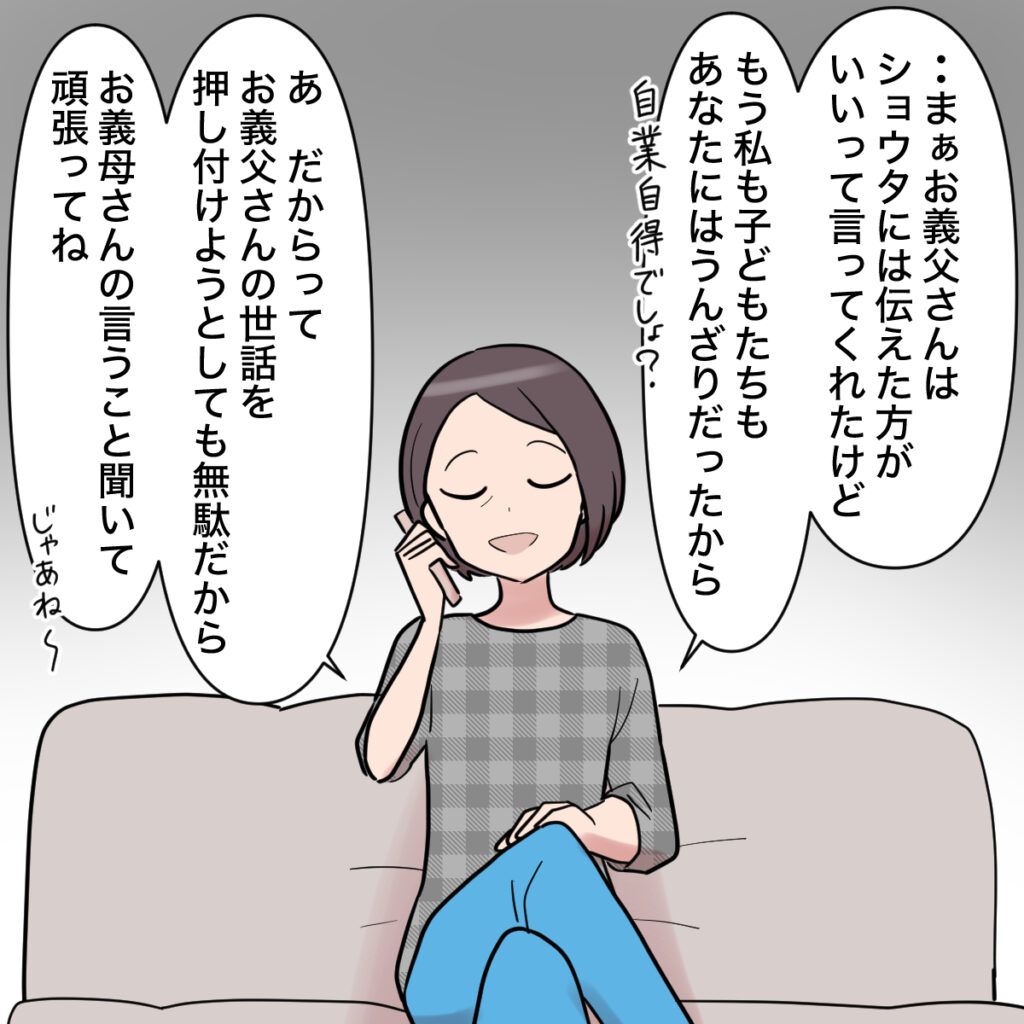 「・・まぁお義父さんはショウタには伝えた方がいいって言ってくれたけど、もう私も子どもたちもあなたにはうんざりだったから。自業自得でしょ?」と落ち着いて答えました。そして、私と義父の仲が良好だと知ったショウタが考えそうなことがわかった私は「あ、だからってお義父さんの世話を押し付けようとしても無駄だから。お義母さんの言うこと聞いて頑張ってね。じゃあね~」と言ってさっさと電話を切りました。