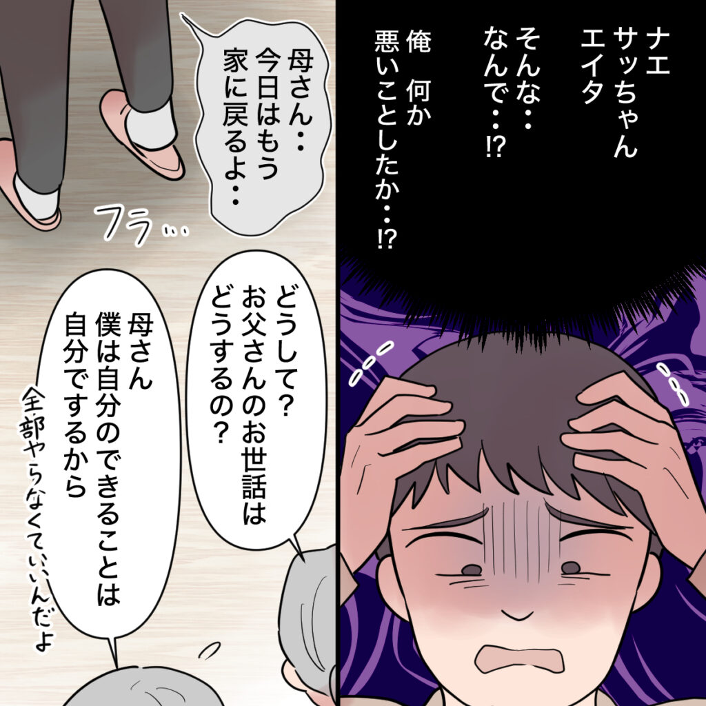 家族から完全に見捨てられたと気付いたショウタですが「そんな・・なんで・・!?俺、何か悪いことしたか・・!?」と、こうなった原因が自分にあるとは気付かず、ただただショックを受けていました。「母さん・・今日はもう戻るよ・・」とフラフラと帰ろうとするショウタに、義母は「どうして?お父さんのお世話はどうするの?」と息子の心配より自分の心配。そんな義母を「母さん、僕は自分のできることは自分でするから」と言って義父がなだめ、ショウタは帰ることができました。