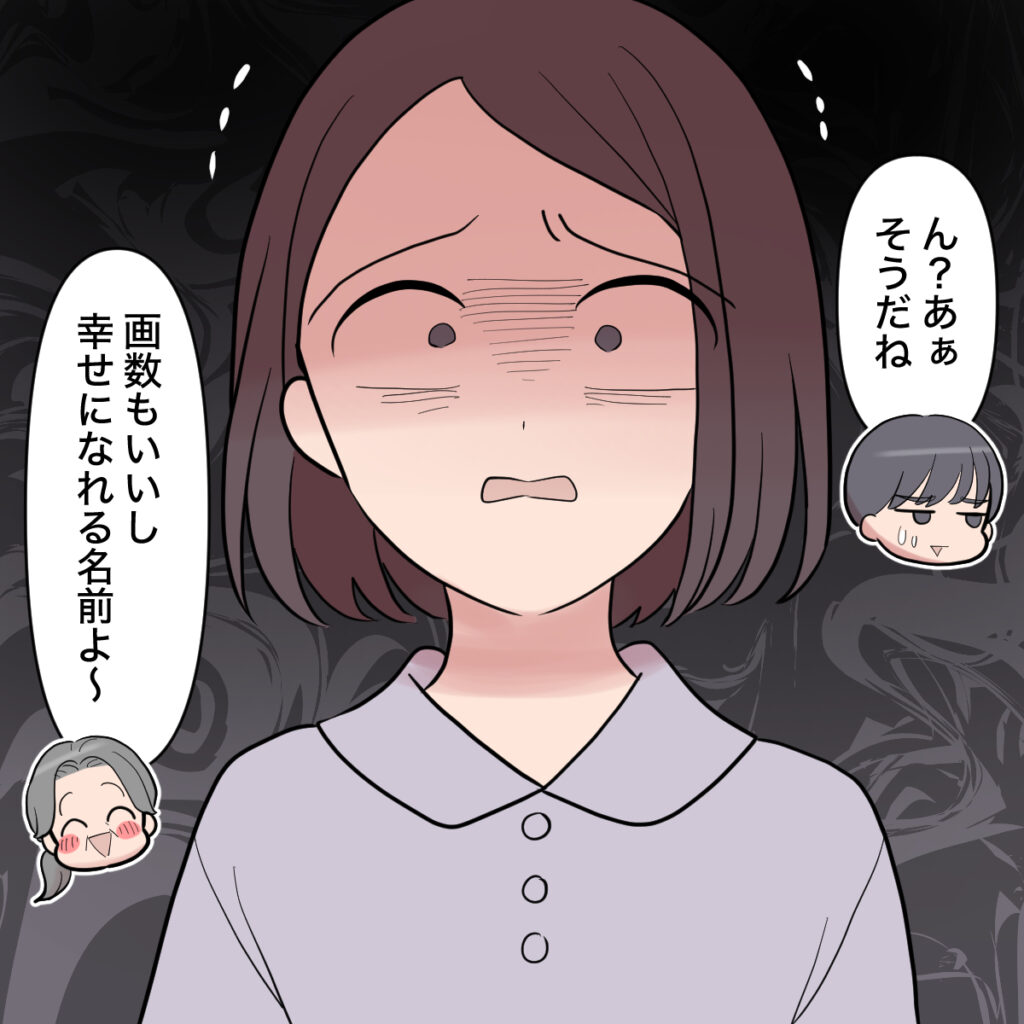 明らかに動揺して、「ん?あぁそうだね」と言葉を濁し、目をそらすショウタ。義母は「画数もいいし、幸せになれる名前よ~」と自信満々です。