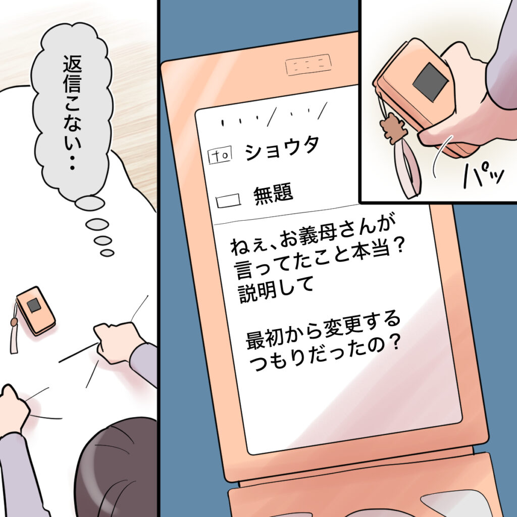 義父母を送ると言って出て行ったショウタに『お義母さんが言ってたこと本当?説明して。最初から変更するつもりだったの?』とメッセージを送って待っても、その日、返信は届きませんでした。