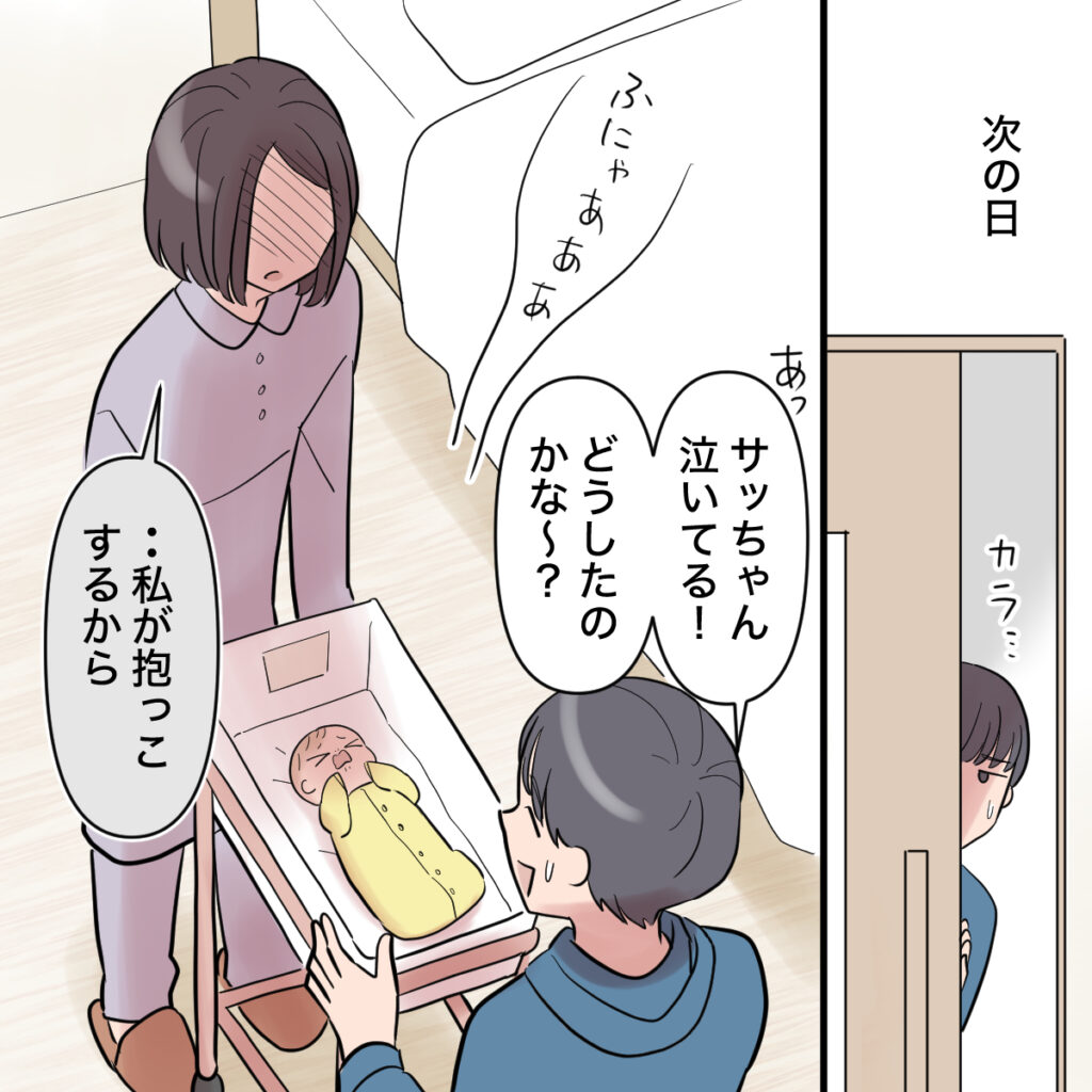 翌日になって、ばつの悪い顔でそっと病室をのぞきに来たショウタは、タイミングよく泣き出したサッちゃんに「サッちゃん泣いてる!どうしたのかな~」と言いながら部屋に入ってきました。私は「私が抱っこするから。」と、無表情。