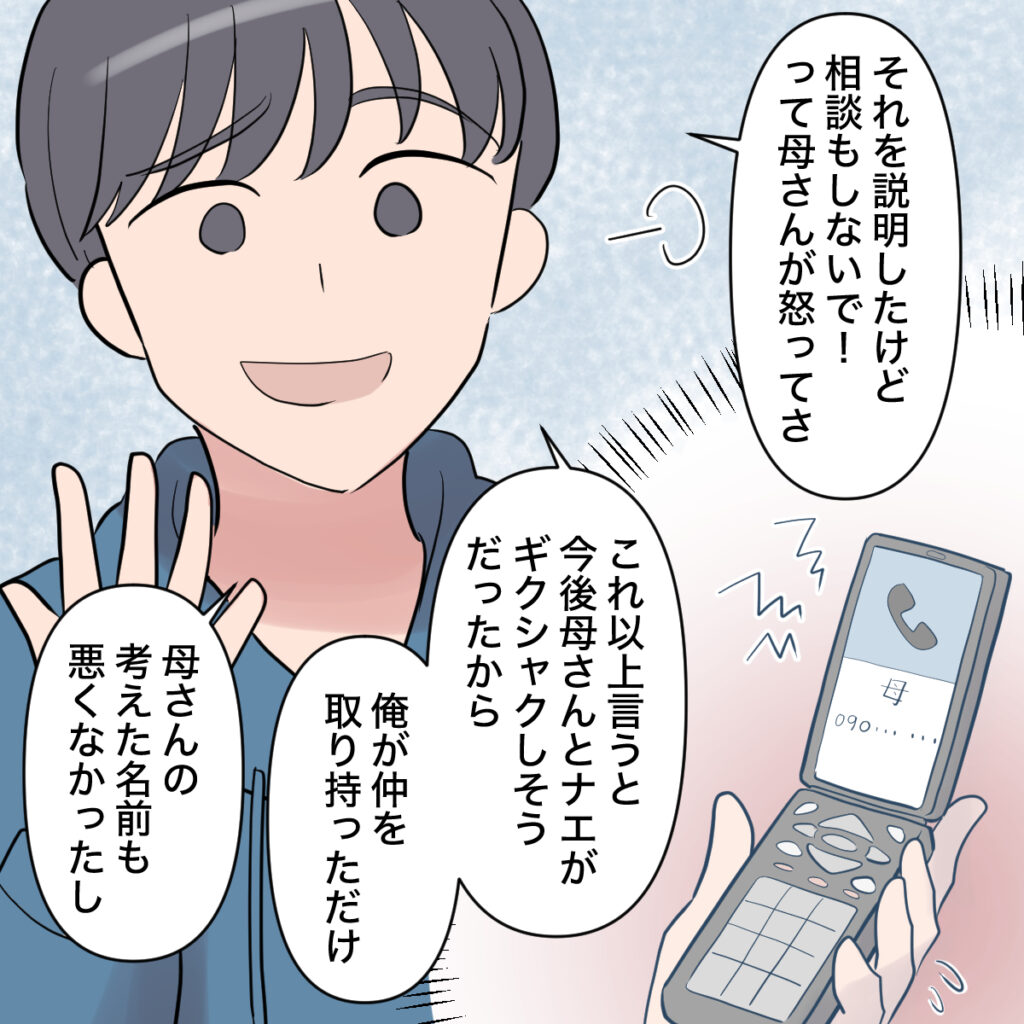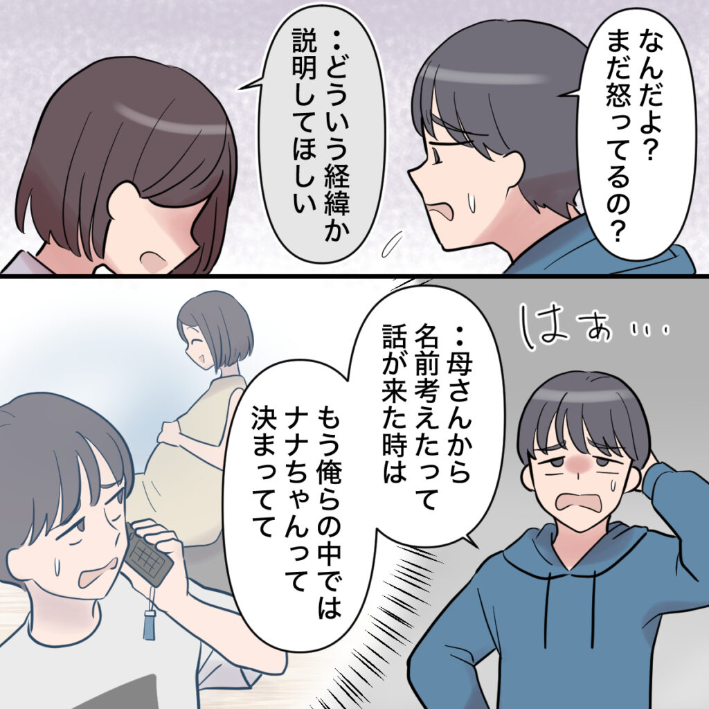 ショウタは2人で一生懸命考えてナナちゃんと名付けたことを義母に伝えたそうですが、義母は自分に相談もなく決めたと怒り出したそうです。怒りの言葉を並べる義母との電話に、ショウタはそれ以上何か言うと、義母と私がぎくしゃくしそうだから仲を取り持つために自分のせいにして名前変更した、と言いました。それに、ショウタにとっては義母が考えた「サチコ」も悪くなかったと。どうして娘の親である私たちが一緒に考えて決めた名前なのに、毎日「ナナちゃん」って呼んでいたのに、義母の希望の通りに変えられてしまう全く意味が分かりませんでした。