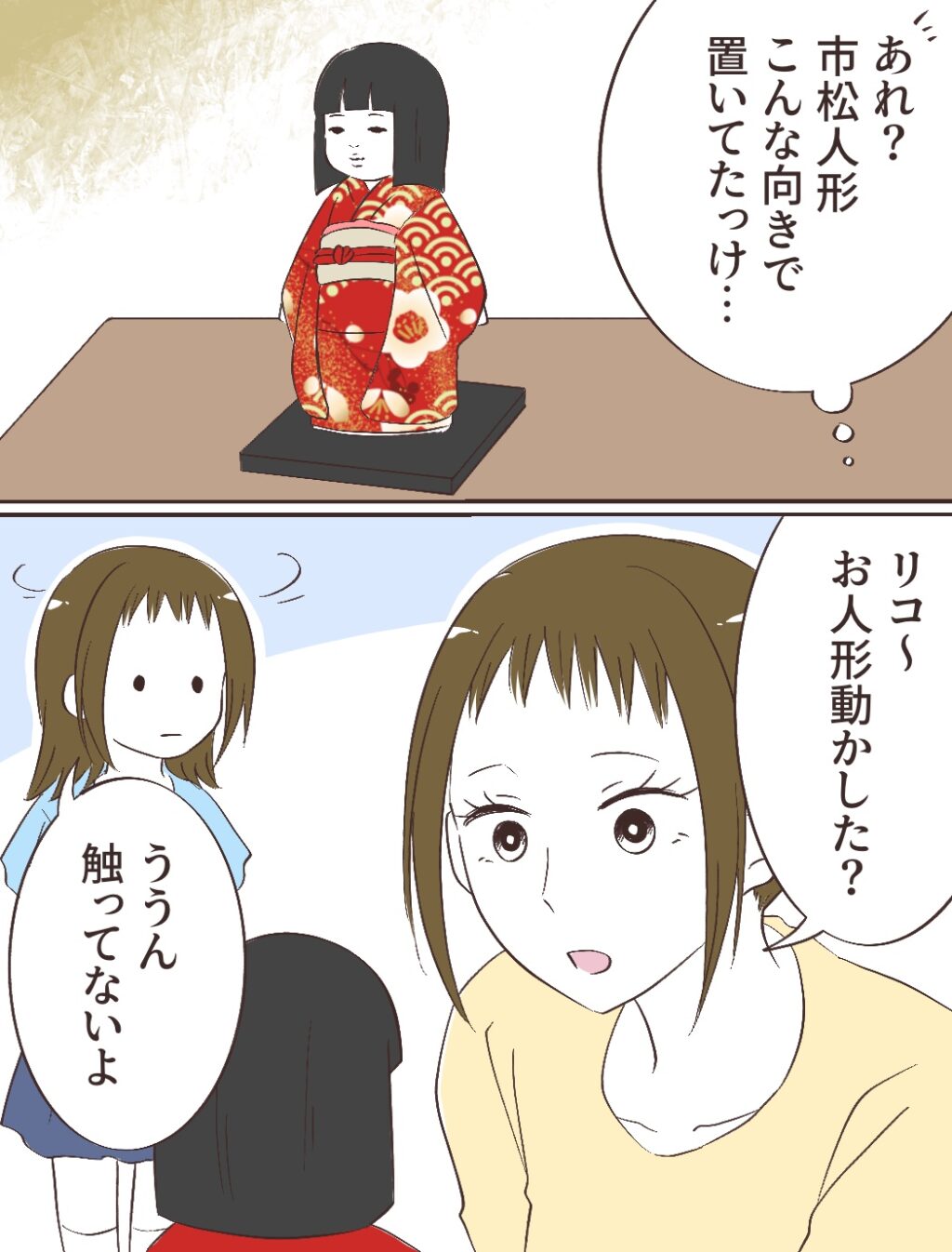 リコがファミレスで誰もいないテーブルにおじさんとおばさんがいると言ったり、寝かしつけをする私の隣におじさんが寝ていると言ったりという恐怖体験をしてからしばらく経った頃、私は自宅の市松人形を見てふと違和感を覚えました。「あれ?市松人形こんな向きで置いてたっけ・・」と思った私は、「リコ~。お人形動かした?」と聞いてみるも「ううん。触ってないよ」とリコは言います。