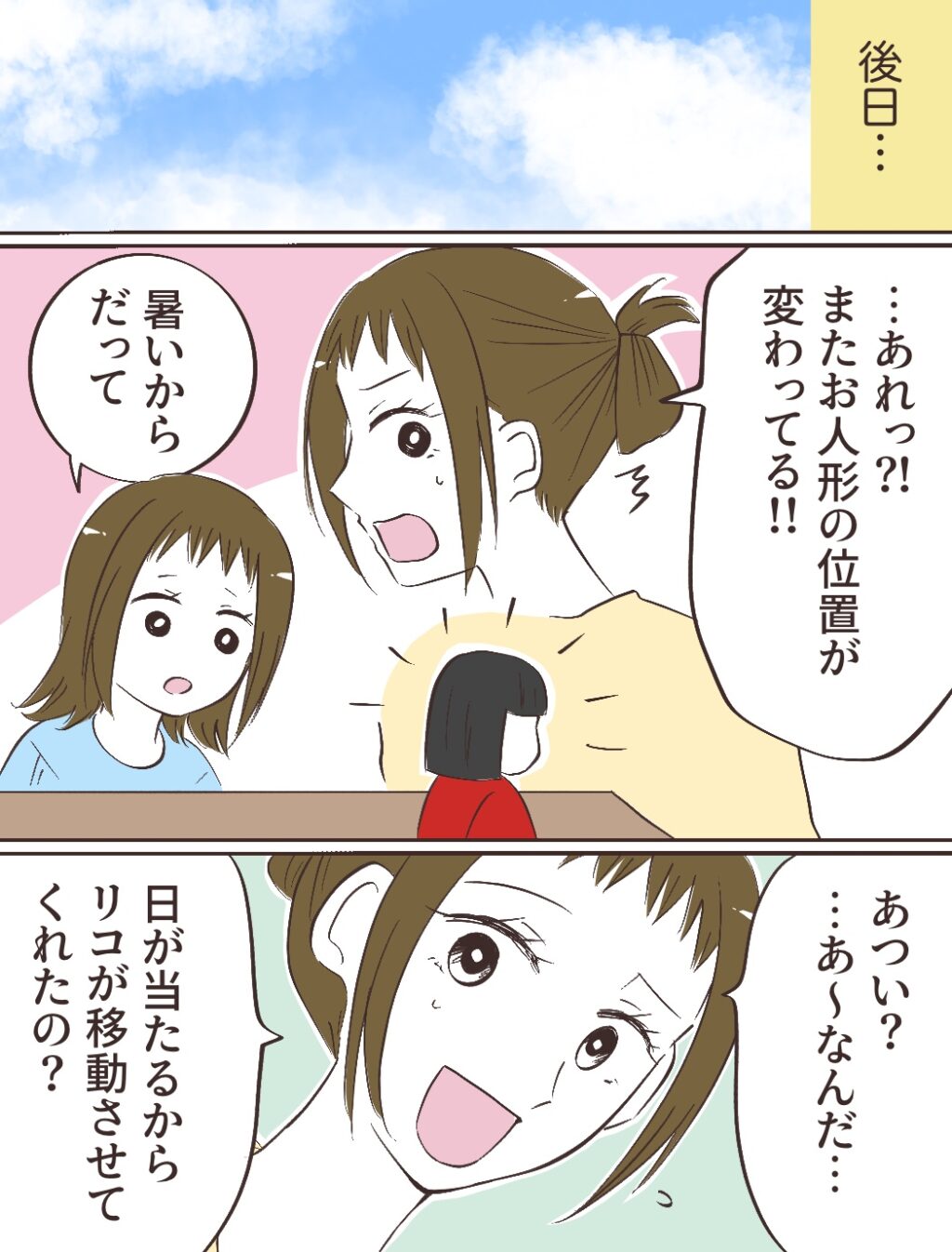 それからまた数日後・・。人形を見ると明らかにまた位置が変わっていました。「・・あれ?!またお人形の位置が変わってる!!」と私が驚いていると、リコが「暑いからだって」と言ったのです。まるで誰かに聞いたような言い方をするリコに違和感を覚えた私は、少し考えて「あつい?・・あ~なんだ・・日が当たるからリコが移動させてくれたの?」と聞いてみたのですが、