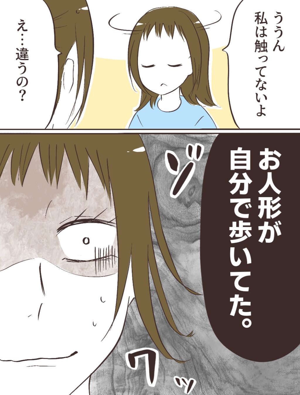 「ううん。私は触ってないよ」とリコはきっぱりと否定。「え・・違うの?」と聞くと・・リコは「お人形が自分で歩いてた」と平然と言ったのです。嘘を言っているようには到底見えないリコの様子に私はゾワッと鳥肌が立ちました。