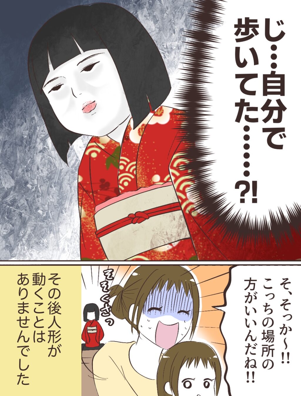 じ・・自分で歩いてた・・・・?!リコの言葉を頭の中で繰り返しながら私は冷や汗ダラダラ。「そ、そっか~!!こっちの場所の方がいいんだね!!」と引きつる笑顔で言いながらリコを連れてそそくさとその場を離れました。動くはずのない人形が歩くという信じがたい現象を体験した私ですが・・その後、人形が動くことはありませんでした。あれは一体なんだったのでしょう。
