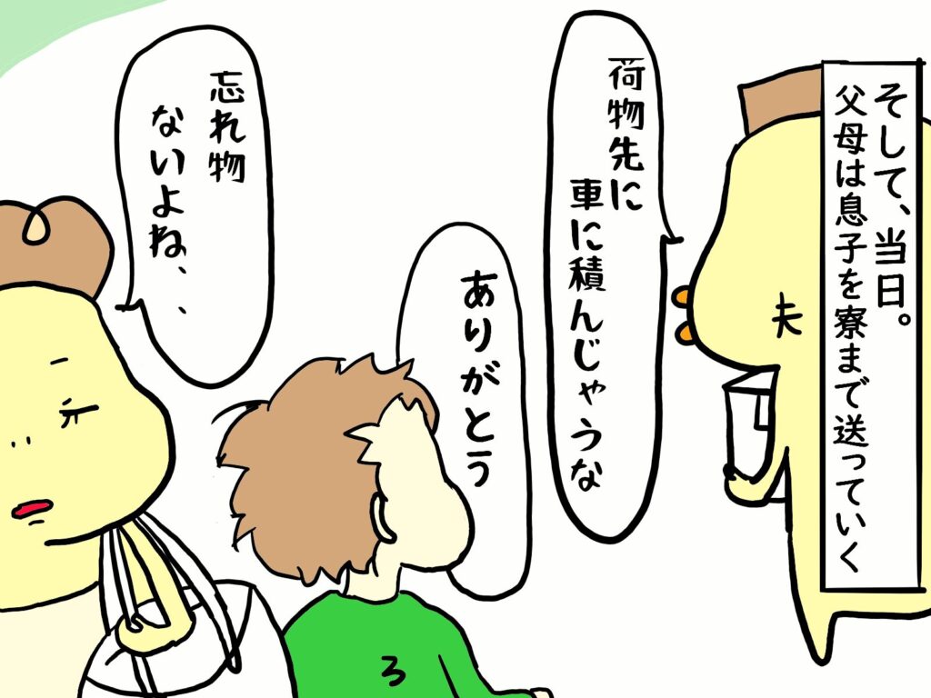 そして、長男くんが家を出る当日。てる子さん夫婦は長男くんを寮まで送っていきました。